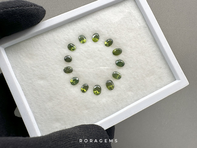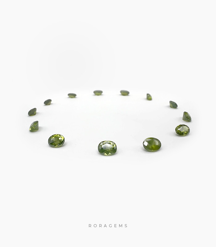Discover a premium set of 13 natural Ceylon green zircon gemstones, each beautifully oval cut and weighing under 1 carat. Sourced directly from the gem-rich lands of Sri Lanka, these vivid green zircons display exceptional brilliance and clarity, making them perfect for custom rings, earrings, pendants, or fine jewelry design.